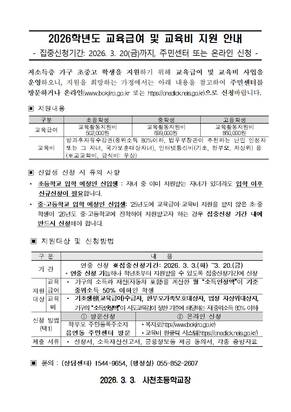 2026학년도 교육급여 및 교육비 지원 신청 안내